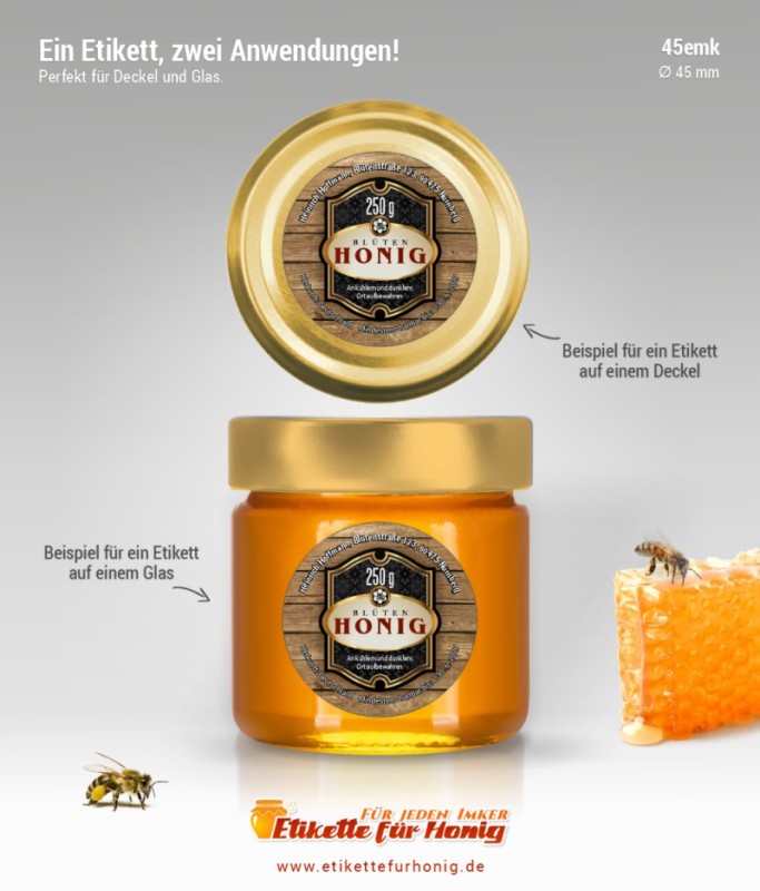 Runde Etikette für Honig, geeignet sowohl für Gläser aller Größen, als auch für alle Deckel, für die der Etikettdurchmesser von 45 mm passt.