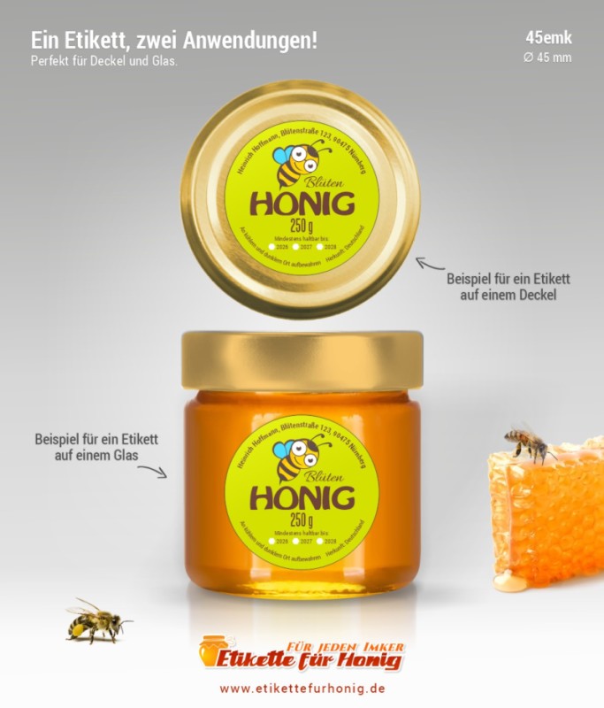 Runde Etikette für Honig, geeignet sowohl für Gläser aller Größen, als auch für alle Deckel, für die der Etikettdurchmesser von 45 mm passt.