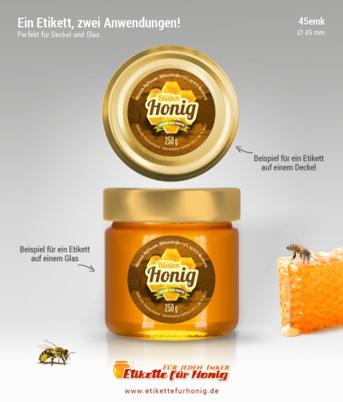 Runde Etikette für Honig, geeignet sowohl für Gläser aller Größen, als auch für alle Deckel, für die der Etikettdurchmesser von 45 mm passt.