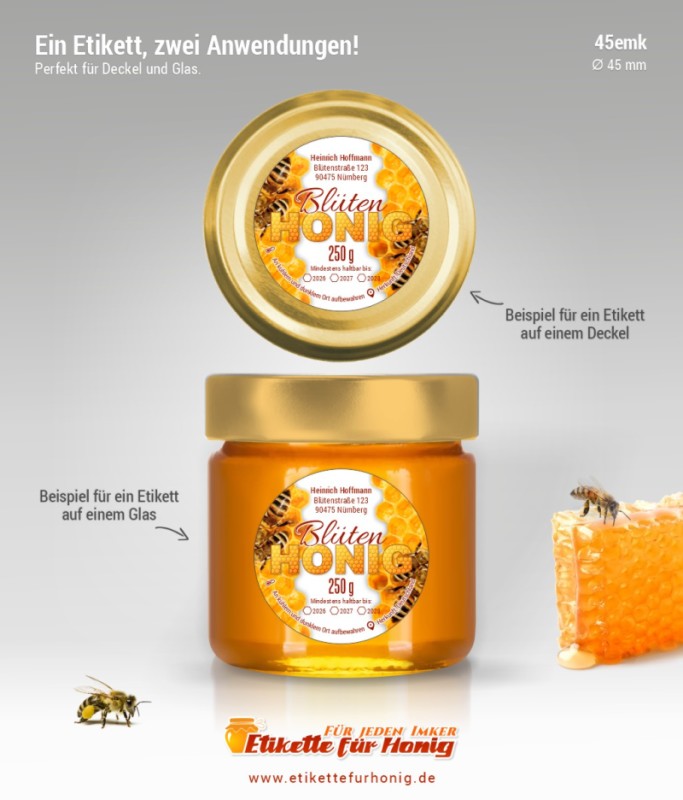 Runde Etikette für Honig, geeignet sowohl für Gläser aller Größen, als auch für alle Deckel, für die der Etikettdurchmesser von 45 mm passt.