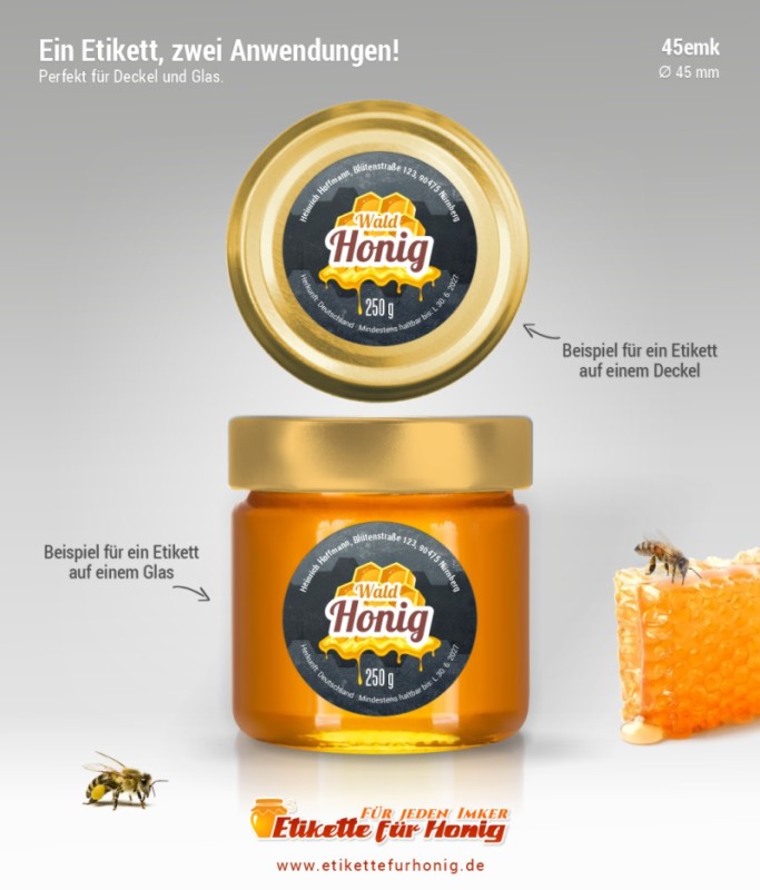 Runde Etikette für Honig, geeignet sowohl für Gläser aller Größen, als auch für alle Deckel, für die der Etikettdurchmesser von 45 mm passt.