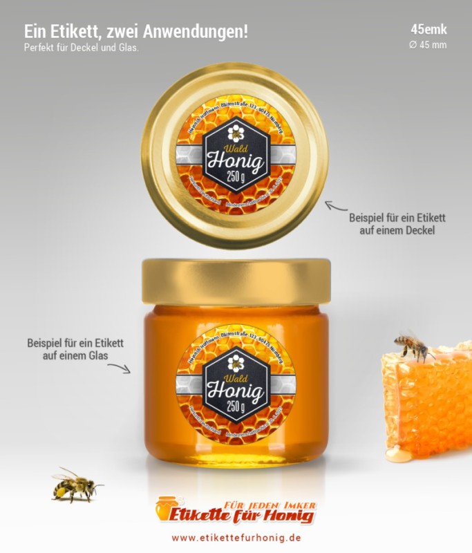 Runde Etikette für Honig, geeignet sowohl für Gläser aller Größen, als auch für alle Deckel, für die der Etikettdurchmesser von 45 mm passt.