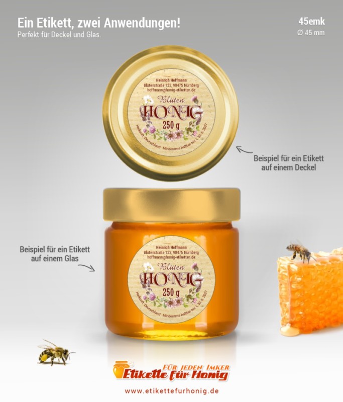 Runde Etikette für Honig, geeignet sowohl für Gläser aller Größen, als auch für alle Deckel, für die der Etikettdurchmesser von 45 mm passt.