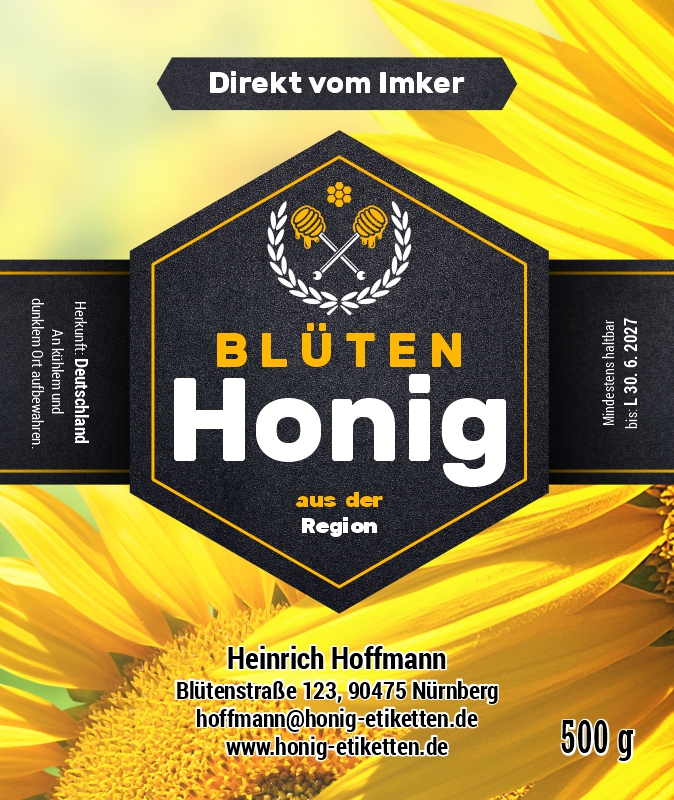 Das Etikett wird nach Ihren angegebenen Daten angepasst.Wir fügen Ihr Logo, Ihre Marke oder Ihr eigenes Bild in die Vorlage ein. Bitte laden Sie das Logo in der Bestellung hoch oder senden Sie es per E‑Mail.Wir färben das Etikett in Ihre Wunschfarben um (z. B. Farbe der Honigsorte, Firmenfarben, anderer Hintergrundton). Beschreiben Sie Ihre Vorstellung oder Farbangabe im Hinweisfeld.Wir passen die Schrift nach Ihren Wünschen an (anderer Stil, anderer Charakter). Beschreiben Sie Ihre Vorstellung im Hinweisfeld.Verschieben von Texten, Größenänderungen, andere Anordnung der Elemente innerhalb der Vorlage. Beschreiben Sie Ihre Vorstellung im Hinweisfeld.Wir fügen Ihr Foto ein (z. B. Bienenstöcke, Bienen, Landschaft). Bitte laden Sie das Foto in der Bestellung hoch oder senden Sie es per E‑Mail.Hinzufügen kleiner Elemente (Biene, Blume, Ornament), Detailanpassungen über die Standard‑Personalisierung hinaus. Beschreiben Sie Ihre Vorstellung im Hinweisfeld.Größere grafische Eingriffe, aber weiterhin auf Basis der Vorlage (deutlichere Änderungen, mehrere Anpassungen gleichzeitig). Beschreiben Sie Ihre Vorstellung im Hinweisfeld.Umfassende Überarbeitung des Designs, aber weiterhin auf Basis der Vorlage (deutliche Änderungen und Anpassungen, mehrere Eingriffe gleichzeitig). Beschreiben Sie Ihre Vorstellung im Hinweisfeld.