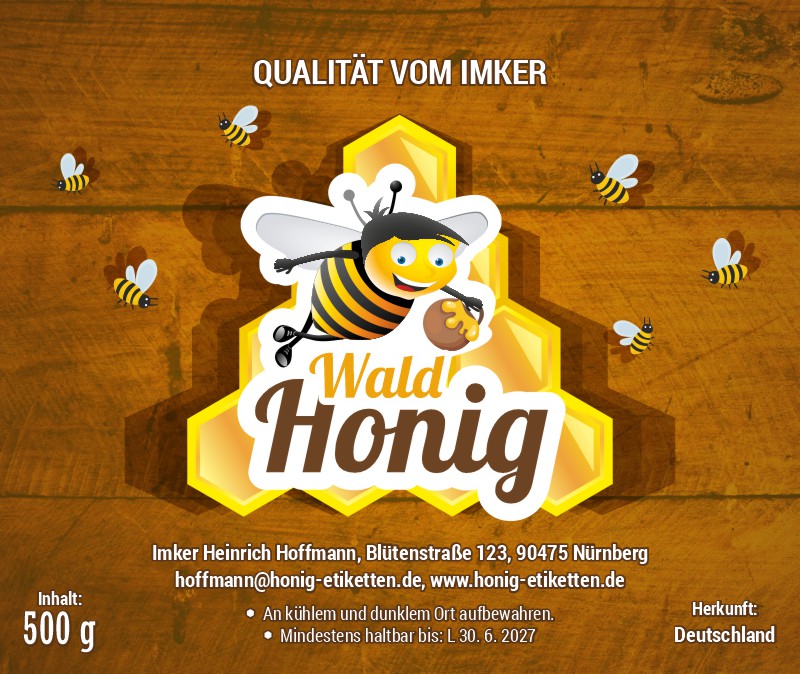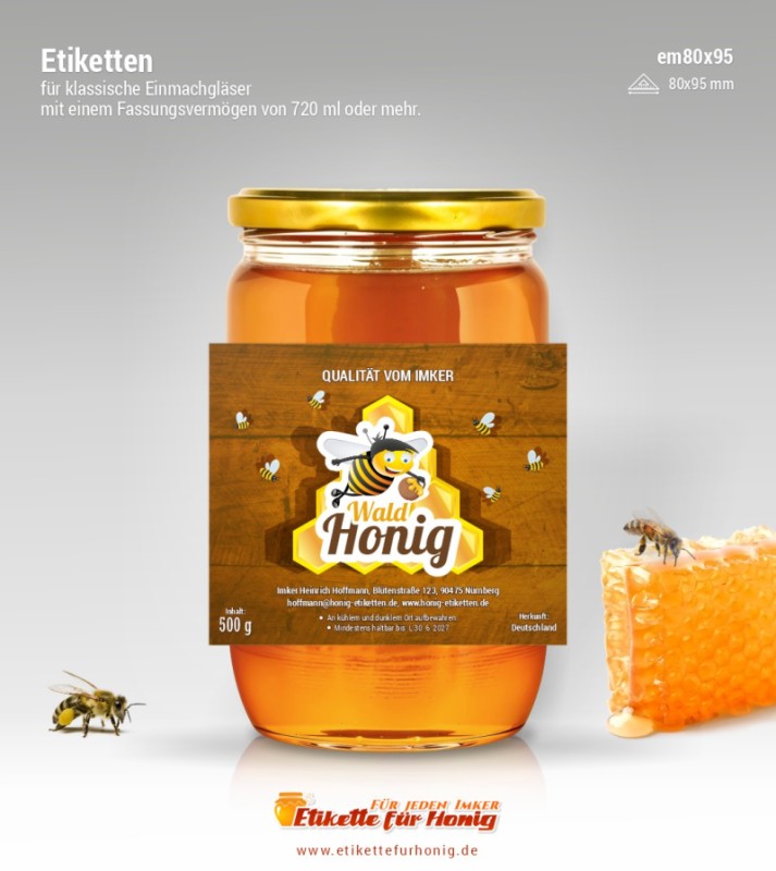 Selbstklebende Etikette für Honig in der Abmessung 95x80mm, geeignet für Gläser größeren und kleineren Volumens, auf denen das Etikett dieser Abmessung gewiss Platz findet.