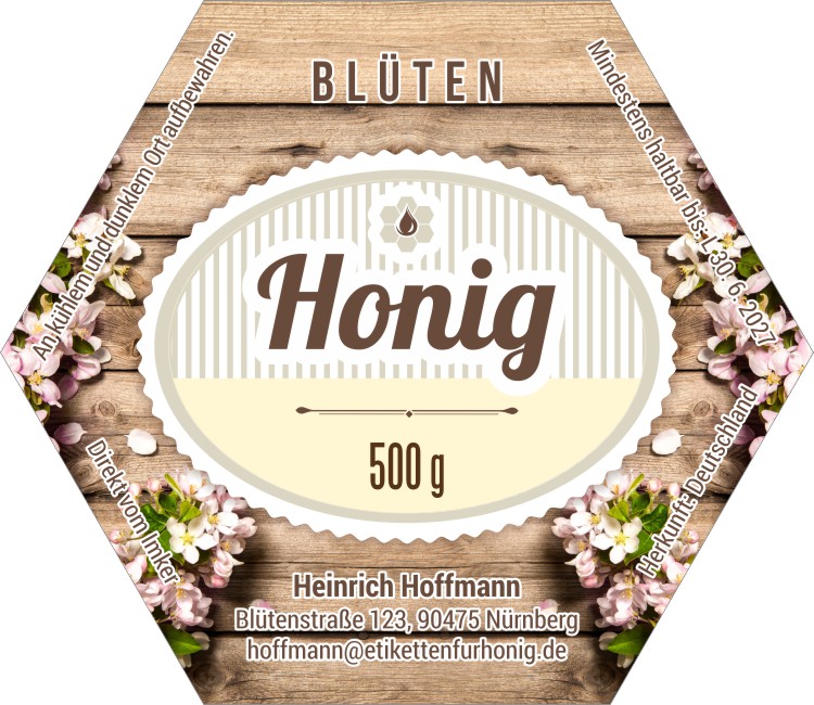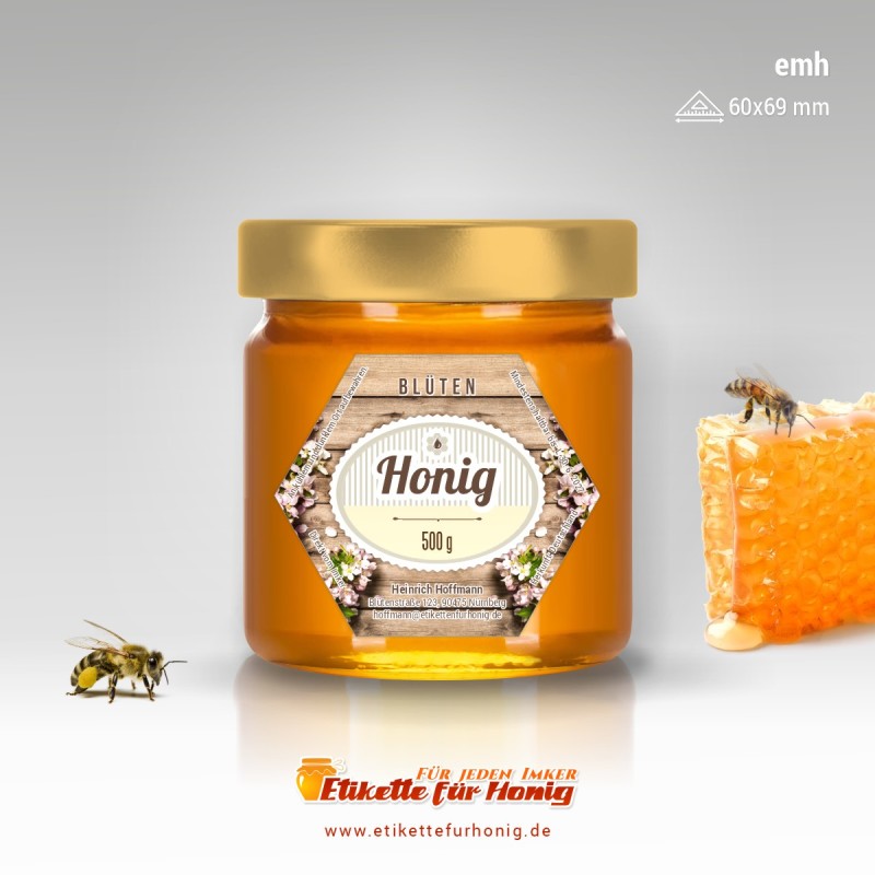 Sechseckige Etikette in Form einer Wabenzelle, geeignet sowohl für Gläser aller Größen, als auch für Deckel, auf welche das Sechseck-Etikett der Abmessung 69 x 60 mm passt.