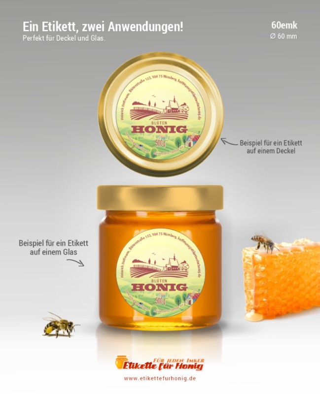 Runde Etikette für Honig, geeignet sowohl für Gläser aller Größen, als auch für alle Deckel, für die der Etikettdurchmesser von 60 mm passt.