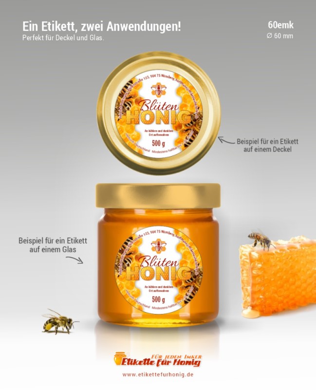 Runde Etikette für Honig, geeignet sowohl für Gläser aller Größen, als auch für alle Deckel, für die der Etikettdurchmesser von 60 mm passt.