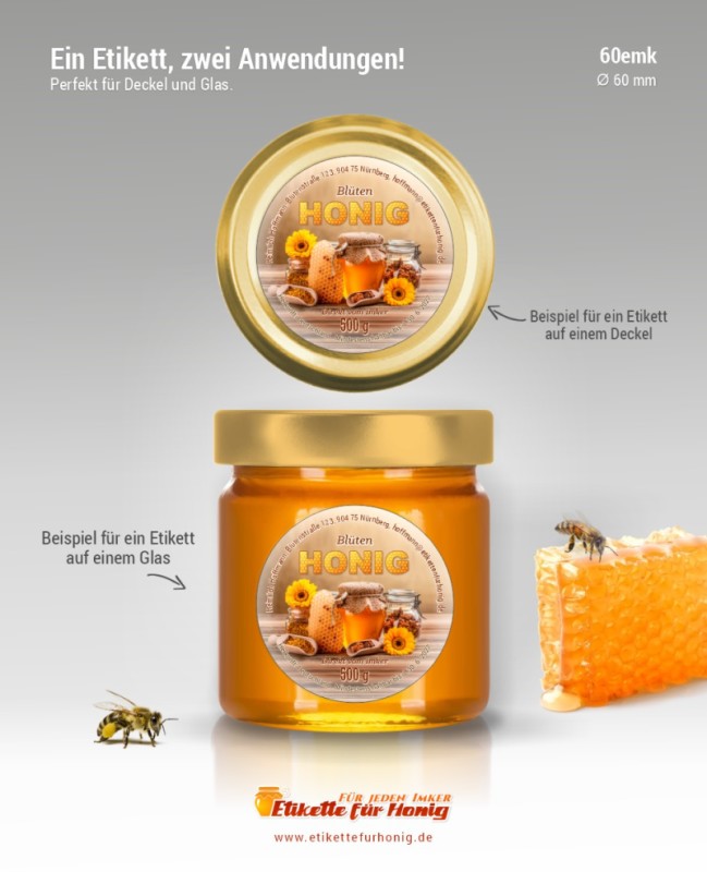 Runde Etikette für Honig, geeignet sowohl für Gläser aller Größen, als auch für alle Deckel, für die der Etikettdurchmesser von 60 mm passt.