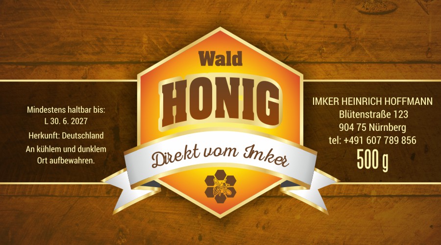 Das Etikett wird nach Ihren angegebenen Daten angepasst.Wir fügen Ihr Logo, Ihre Marke oder Ihr eigenes Bild in die Vorlage ein. Bitte laden Sie das Logo in der Bestellung hoch oder senden Sie es per E‑Mail.Wir färben das Etikett in Ihre Wunschfarben um (z. B. Farbe der Honigsorte, Firmenfarben, anderer Hintergrundton). Beschreiben Sie Ihre Vorstellung oder Farbangabe im Hinweisfeld.Wir passen die Schrift nach Ihren Wünschen an (anderer Stil, anderer Charakter). Beschreiben Sie Ihre Vorstellung im Hinweisfeld.Verschieben von Texten, Größenänderungen, andere Anordnung der Elemente innerhalb der Vorlage. Beschreiben Sie Ihre Vorstellung im Hinweisfeld.Wir fügen Ihr Foto ein (z. B. Bienenstöcke, Bienen, Landschaft). Bitte laden Sie das Foto in der Bestellung hoch oder senden Sie es per E‑Mail.Hinzufügen kleiner Elemente (Biene, Blume, Ornament), Detailanpassungen über die Standard‑Personalisierung hinaus. Beschreiben Sie Ihre Vorstellung im Hinweisfeld.Größere grafische Eingriffe, aber weiterhin auf Basis der Vorlage (deutlichere Änderungen, mehrere Anpassungen gleichzeitig). Beschreiben Sie Ihre Vorstellung im Hinweisfeld.Umfassende Überarbeitung des Designs, aber weiterhin auf Basis der Vorlage (deutliche Änderungen und Anpassungen, mehrere Eingriffe gleichzeitig). Beschreiben Sie Ihre Vorstellung im Hinweisfeld.
