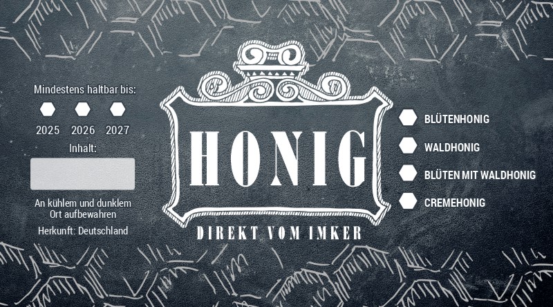 Dieses Etikett ist für die universelle Verwendung bestimmt und wird so geliefert, wie Sie es sehen. Bei diesen Universaletiketten sind keinerlei Änderungen oder Ergänzungen der Angaben möglich. Auf dem Etikett können Sie anschließend selbst das Gewicht, das Jahr, die Art des Honigs oder die Bezeichnung des Imkers in den vorgedruckten Feldern, z.B. Mit einem Marker, ankreuzen oder hinzufügen.