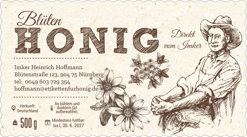 Wählen Sie die Honigsorte oder schreiben Sie Ihre eigene.Geben Sie Ihre Bezeichnung der Honigsorte ein.„Auf dem Etikett wird die ausgewählte Honigsorte angegeben.„Auf dem Etikett wird die ausgewählte Honigsorte angegeben.„Auf dem Etikett wird die ausgewählte Honigsorte angegeben.„Auf dem Etikett wird die ausgewählte Honigsorte angegeben.„Auf dem Etikett wird die ausgewählte Honigsorte angegeben.„Auf dem Etikett wird die ausgewählte Honigsorte angegeben.„Auf dem Etikett wird die ausgewählte Honigsorte angegeben.„Auf dem Etikett wird die ausgewählte Honigsorte angegeben.„Auf dem Etikett wird die ausgewählte Honigsorte angegeben.„Auf dem Etikett wird die ausgewählte Honigsorte angegeben.„Auf dem Etikett wird die ausgewählte Honigsorte angegeben.„Es wird keine Honigsorte angegeben. Es bleibt nur die Bezeichnung HONIG.