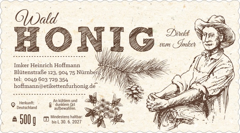 Das Etikett wird nach Ihren angegebenen Daten angepasst.Wir fügen Ihr Logo, Ihre Marke oder Ihr eigenes Bild in die Vorlage ein. Bitte laden Sie das Logo in der Bestellung hoch oder senden Sie es per E‑Mail.Wir färben das Etikett in Ihre Wunschfarben um (z. B. Farbe der Honigsorte, Firmenfarben, anderer Hintergrundton). Beschreiben Sie Ihre Vorstellung oder Farbangabe im Hinweisfeld.Wir passen die Schrift nach Ihren Wünschen an (anderer Stil, anderer Charakter). Beschreiben Sie Ihre Vorstellung im Hinweisfeld.Verschieben von Texten, Größenänderungen, andere Anordnung der Elemente innerhalb der Vorlage. Beschreiben Sie Ihre Vorstellung im Hinweisfeld.Wir fügen Ihr Foto ein (z. B. Bienenstöcke, Bienen, Landschaft). Bitte laden Sie das Foto in der Bestellung hoch oder senden Sie es per E‑Mail.Hinzufügen kleiner Elemente (Biene, Blume, Ornament), Detailanpassungen über die Standard‑Personalisierung hinaus. Beschreiben Sie Ihre Vorstellung im Hinweisfeld.Größere grafische Eingriffe, aber weiterhin auf Basis der Vorlage (deutlichere Änderungen, mehrere Anpassungen gleichzeitig). Beschreiben Sie Ihre Vorstellung im Hinweisfeld.Umfassende Überarbeitung des Designs, aber weiterhin auf Basis der Vorlage (deutliche Änderungen und Anpassungen, mehrere Eingriffe gleichzeitig). Beschreiben Sie Ihre Vorstellung im Hinweisfeld.