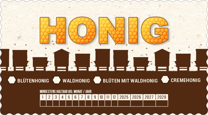 Dieses Etikett ist für die universelle Verwendung bestimmt und wird so geliefert, wie Sie es sehen. Bei diesen Universaletiketten sind keinerlei Änderungen oder Ergänzungen der Angaben möglich. Auf dem Etikett können Sie anschließend selbst das Gewicht, das Jahr, die Art des Honigs oder die Bezeichnung des Imkers in den vorgedruckten Feldern, z.B. Mit einem Marker, ankreuzen oder hinzufügen.