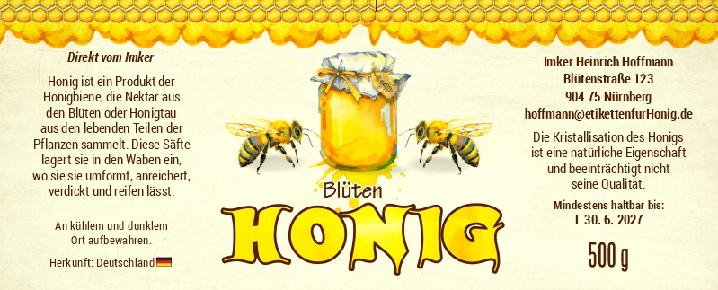 Wählen Sie die Honigsorte oder schreiben Sie Ihre eigene.Geben Sie Ihre Bezeichnung der Honigsorte ein.„Auf dem Etikett wird die ausgewählte Honigsorte angegeben.„Auf dem Etikett wird die ausgewählte Honigsorte angegeben.„Auf dem Etikett wird die ausgewählte Honigsorte angegeben.„Auf dem Etikett wird die ausgewählte Honigsorte angegeben.„Auf dem Etikett wird die ausgewählte Honigsorte angegeben.„Auf dem Etikett wird die ausgewählte Honigsorte angegeben.„Auf dem Etikett wird die ausgewählte Honigsorte angegeben.„Auf dem Etikett wird die ausgewählte Honigsorte angegeben.„Auf dem Etikett wird die ausgewählte Honigsorte angegeben.„Auf dem Etikett wird die ausgewählte Honigsorte angegeben.„Auf dem Etikett wird die ausgewählte Honigsorte angegeben.„Es wird keine Honigsorte angegeben. Es bleibt nur die Bezeichnung HONIG.