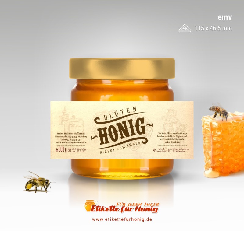 Das Etikett wird nach Ihren angegebenen Daten angepasst.Wir fügen Ihr Logo, Ihre Marke oder Ihr eigenes Bild in die Vorlage ein. Bitte laden Sie das Logo in der Bestellung hoch oder senden Sie es per E‑Mail.Wir färben das Etikett in Ihre Wunschfarben um (z. B. Farbe der Honigsorte, Firmenfarben, anderer Hintergrundton). Beschreiben Sie Ihre Vorstellung oder Farbangabe im Hinweisfeld.Wir passen die Schrift nach Ihren Wünschen an (anderer Stil, anderer Charakter). Beschreiben Sie Ihre Vorstellung im Hinweisfeld.Verschieben von Texten, Größenänderungen, andere Anordnung der Elemente innerhalb der Vorlage. Beschreiben Sie Ihre Vorstellung im Hinweisfeld.Wir fügen Ihr Foto ein (z. B. Bienenstöcke, Bienen, Landschaft). Bitte laden Sie das Foto in der Bestellung hoch oder senden Sie es per E‑Mail.Hinzufügen kleiner Elemente (Biene, Blume, Ornament), Detailanpassungen über die Standard‑Personalisierung hinaus. Beschreiben Sie Ihre Vorstellung im Hinweisfeld.Größere grafische Eingriffe, aber weiterhin auf Basis der Vorlage (deutlichere Änderungen, mehrere Anpassungen gleichzeitig). Beschreiben Sie Ihre Vorstellung im Hinweisfeld.Umfassende Überarbeitung des Designs, aber weiterhin auf Basis der Vorlage (deutliche Änderungen und Anpassungen, mehrere Eingriffe gleichzeitig). Beschreiben Sie Ihre Vorstellung im Hinweisfeld.