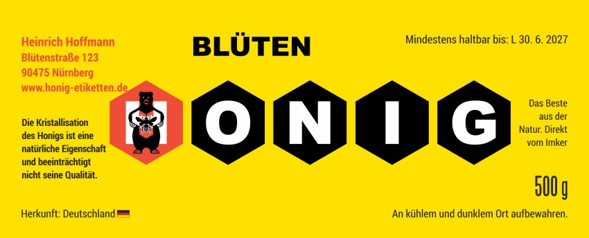 Wählen Sie die Honigsorte oder schreiben Sie Ihre eigene.Geben Sie Ihre Bezeichnung der Honigsorte ein.„Auf dem Etikett wird die ausgewählte Honigsorte angegeben.„Auf dem Etikett wird die ausgewählte Honigsorte angegeben.„Auf dem Etikett wird die ausgewählte Honigsorte angegeben.„Auf dem Etikett wird die ausgewählte Honigsorte angegeben.„Auf dem Etikett wird die ausgewählte Honigsorte angegeben.„Auf dem Etikett wird die ausgewählte Honigsorte angegeben.„Auf dem Etikett wird die ausgewählte Honigsorte angegeben.„Auf dem Etikett wird die ausgewählte Honigsorte angegeben.„Auf dem Etikett wird die ausgewählte Honigsorte angegeben.„Auf dem Etikett wird die ausgewählte Honigsorte angegeben.„Auf dem Etikett wird die ausgewählte Honigsorte angegeben.„Es wird keine Honigsorte angegeben. Es bleibt nur die Bezeichnung HONIG.
