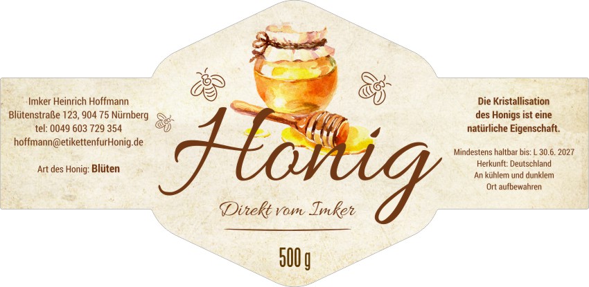 Wählen Sie die Honigsorte oder schreiben Sie Ihre eigene.Geben Sie Ihre Bezeichnung der Honigsorte ein.„Auf dem Etikett wird die ausgewählte Honigsorte angegeben.„Auf dem Etikett wird die ausgewählte Honigsorte angegeben.„Auf dem Etikett wird die ausgewählte Honigsorte angegeben.„Auf dem Etikett wird die ausgewählte Honigsorte angegeben.„Auf dem Etikett wird die ausgewählte Honigsorte angegeben.„Auf dem Etikett wird die ausgewählte Honigsorte angegeben.„Auf dem Etikett wird die ausgewählte Honigsorte angegeben.„Auf dem Etikett wird die ausgewählte Honigsorte angegeben.„Auf dem Etikett wird die ausgewählte Honigsorte angegeben.„Auf dem Etikett wird die ausgewählte Honigsorte angegeben.„Auf dem Etikett wird die ausgewählte Honigsorte angegeben.„Es wird keine Honigsorte angegeben. Es bleibt nur die Bezeichnung HONIG.