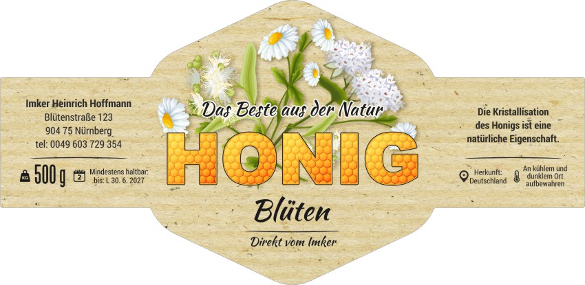 Wählen Sie die Honigsorte oder schreiben Sie Ihre eigene.Geben Sie Ihre Bezeichnung der Honigsorte ein.„Auf dem Etikett wird die ausgewählte Honigsorte angegeben.„Auf dem Etikett wird die ausgewählte Honigsorte angegeben.„Auf dem Etikett wird die ausgewählte Honigsorte angegeben.„Auf dem Etikett wird die ausgewählte Honigsorte angegeben.„Auf dem Etikett wird die ausgewählte Honigsorte angegeben.„Auf dem Etikett wird die ausgewählte Honigsorte angegeben.„Auf dem Etikett wird die ausgewählte Honigsorte angegeben.„Auf dem Etikett wird die ausgewählte Honigsorte angegeben.„Auf dem Etikett wird die ausgewählte Honigsorte angegeben.„Auf dem Etikett wird die ausgewählte Honigsorte angegeben.„Auf dem Etikett wird die ausgewählte Honigsorte angegeben.„Es wird keine Honigsorte angegeben. Es bleibt nur die Bezeichnung HONIG.