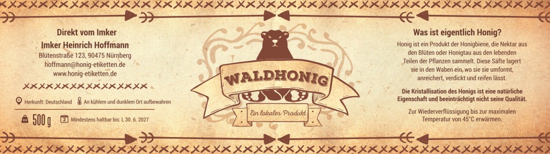 Das Etikett wird nach Ihren angegebenen Daten angepasst.Wir fügen Ihr Logo, Ihre Marke oder Ihr eigenes Bild in die Vorlage ein. Bitte laden Sie das Logo in der Bestellung hoch oder senden Sie es per E‑Mail.Wir färben das Etikett in Ihre Wunschfarben um (z. B. Farbe der Honigsorte, Firmenfarben, anderer Hintergrundton). Beschreiben Sie Ihre Vorstellung oder Farbangabe im Hinweisfeld.Wir passen die Schrift nach Ihren Wünschen an (anderer Stil, anderer Charakter). Beschreiben Sie Ihre Vorstellung im Hinweisfeld.Verschieben von Texten, Größenänderungen, andere Anordnung der Elemente innerhalb der Vorlage. Beschreiben Sie Ihre Vorstellung im Hinweisfeld.Wir fügen Ihr Foto ein (z. B. Bienenstöcke, Bienen, Landschaft). Bitte laden Sie das Foto in der Bestellung hoch oder senden Sie es per E‑Mail.Hinzufügen kleiner Elemente (Biene, Blume, Ornament), Detailanpassungen über die Standard‑Personalisierung hinaus. Beschreiben Sie Ihre Vorstellung im Hinweisfeld.Größere grafische Eingriffe, aber weiterhin auf Basis der Vorlage (deutlichere Änderungen, mehrere Anpassungen gleichzeitig). Beschreiben Sie Ihre Vorstellung im Hinweisfeld.Umfassende Überarbeitung des Designs, aber weiterhin auf Basis der Vorlage (deutliche Änderungen und Anpassungen, mehrere Eingriffe gleichzeitig). Beschreiben Sie Ihre Vorstellung im Hinweisfeld.