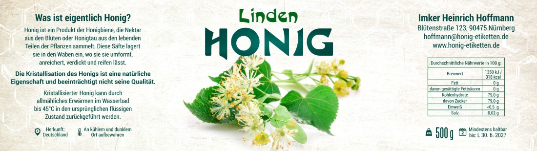 Das Etikett wird nach Ihren angegebenen Daten angepasst.Wir fügen Ihr Logo, Ihre Marke oder Ihr eigenes Bild in die Vorlage ein. Bitte laden Sie das Logo in der Bestellung hoch oder senden Sie es per E‑Mail.Wir färben das Etikett in Ihre Wunschfarben um (z. B. Farbe der Honigsorte, Firmenfarben, anderer Hintergrundton). Beschreiben Sie Ihre Vorstellung oder Farbangabe im Hinweisfeld.Wir passen die Schrift nach Ihren Wünschen an (anderer Stil, anderer Charakter). Beschreiben Sie Ihre Vorstellung im Hinweisfeld.Verschieben von Texten, Größenänderungen, andere Anordnung der Elemente innerhalb der Vorlage. Beschreiben Sie Ihre Vorstellung im Hinweisfeld.Wir fügen Ihr Foto ein (z. B. Bienenstöcke, Bienen, Landschaft). Bitte laden Sie das Foto in der Bestellung hoch oder senden Sie es per E‑Mail.Hinzufügen kleiner Elemente (Biene, Blume, Ornament), Detailanpassungen über die Standard‑Personalisierung hinaus. Beschreiben Sie Ihre Vorstellung im Hinweisfeld.Größere grafische Eingriffe, aber weiterhin auf Basis der Vorlage (deutlichere Änderungen, mehrere Anpassungen gleichzeitig). Beschreiben Sie Ihre Vorstellung im Hinweisfeld.Umfassende Überarbeitung des Designs, aber weiterhin auf Basis der Vorlage (deutliche Änderungen und Anpassungen, mehrere Eingriffe gleichzeitig). Beschreiben Sie Ihre Vorstellung im Hinweisfeld.
