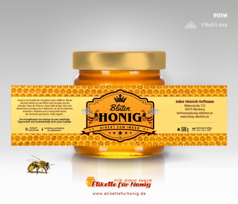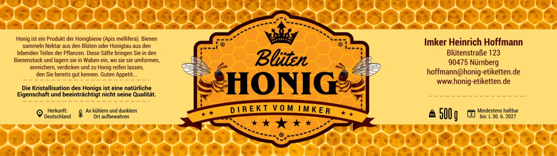 Wählen Sie die Honigsorte oder schreiben Sie Ihre eigene.Geben Sie Ihre Bezeichnung der Honigsorte ein.„Auf dem Etikett wird die ausgewählte Honigsorte angegeben.„Auf dem Etikett wird die ausgewählte Honigsorte angegeben.„Auf dem Etikett wird die ausgewählte Honigsorte angegeben.„Auf dem Etikett wird die ausgewählte Honigsorte angegeben.„Auf dem Etikett wird die ausgewählte Honigsorte angegeben.„Auf dem Etikett wird die ausgewählte Honigsorte angegeben.„Auf dem Etikett wird die ausgewählte Honigsorte angegeben.„Auf dem Etikett wird die ausgewählte Honigsorte angegeben.„Auf dem Etikett wird die ausgewählte Honigsorte angegeben.„Auf dem Etikett wird die ausgewählte Honigsorte angegeben.„Auf dem Etikett wird die ausgewählte Honigsorte angegeben.„Es wird keine Honigsorte angegeben. Es bleibt nur die Bezeichnung HONIG.