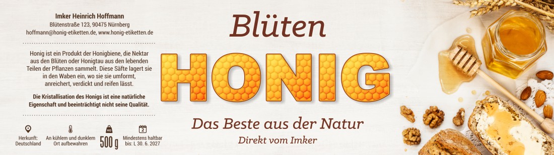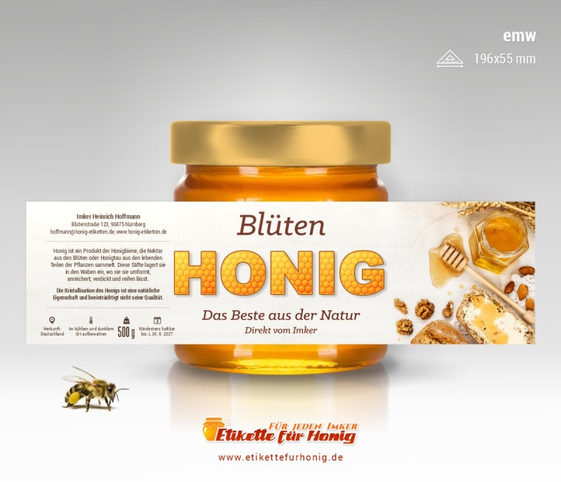 Selbstklebende Etikette für Honig in der Abmessung 196x55mm, geeignet für Gläser größeren und kleineren Volumens, auf denen das Etikett dieser Abmessung gewiss Platz findet.