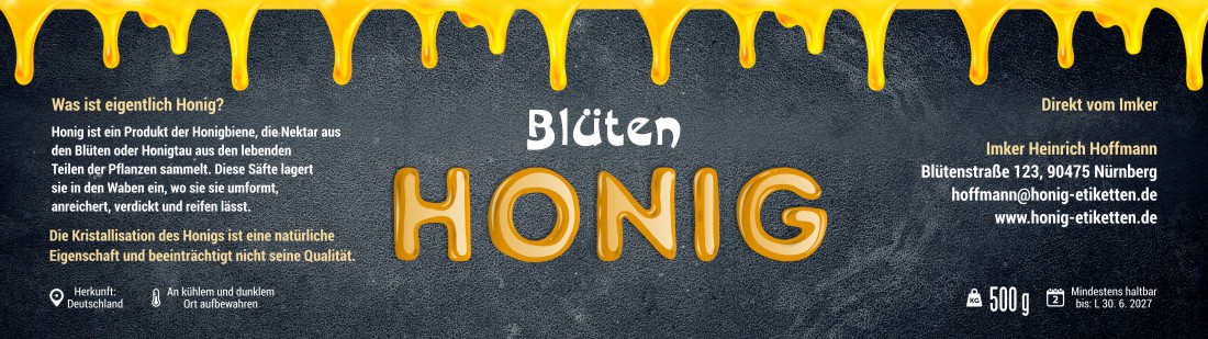 Wählen Sie die Honigsorte oder schreiben Sie Ihre eigene.Geben Sie Ihre Bezeichnung der Honigsorte ein.„Auf dem Etikett wird die ausgewählte Honigsorte angegeben.„Auf dem Etikett wird die ausgewählte Honigsorte angegeben.„Auf dem Etikett wird die ausgewählte Honigsorte angegeben.„Auf dem Etikett wird die ausgewählte Honigsorte angegeben.„Auf dem Etikett wird die ausgewählte Honigsorte angegeben.„Auf dem Etikett wird die ausgewählte Honigsorte angegeben.„Auf dem Etikett wird die ausgewählte Honigsorte angegeben.„Auf dem Etikett wird die ausgewählte Honigsorte angegeben.„Auf dem Etikett wird die ausgewählte Honigsorte angegeben.„Auf dem Etikett wird die ausgewählte Honigsorte angegeben.„Auf dem Etikett wird die ausgewählte Honigsorte angegeben.„Es wird keine Honigsorte angegeben. Es bleibt nur die Bezeichnung HONIG.