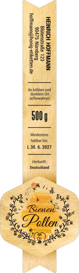 Das Etikett wird nach Ihren angegebenen Daten angepasst.Wir fügen Ihr Logo, Ihre Marke oder Ihr eigenes Bild in die Vorlage ein. Bitte laden Sie das Logo in der Bestellung hoch oder senden Sie es per E‑Mail.Wir färben das Etikett in Ihre Wunschfarben um (z. B. Farbe der Honigsorte, Firmenfarben, anderer Hintergrundton). Beschreiben Sie Ihre Vorstellung oder Farbangabe im Hinweisfeld.Wir passen die Schrift nach Ihren Wünschen an (anderer Stil, anderer Charakter). Beschreiben Sie Ihre Vorstellung im Hinweisfeld.Verschieben von Texten, Größenänderungen, andere Anordnung der Elemente innerhalb der Vorlage. Beschreiben Sie Ihre Vorstellung im Hinweisfeld.Wir fügen Ihr Foto ein (z. B. Bienenstöcke, Bienen, Landschaft). Bitte laden Sie das Foto in der Bestellung hoch oder senden Sie es per E‑Mail.Hinzufügen kleiner Elemente (Biene, Blume, Ornament), Detailanpassungen über die Standard‑Personalisierung hinaus. Beschreiben Sie Ihre Vorstellung im Hinweisfeld.Größere grafische Eingriffe, aber weiterhin auf Basis der Vorlage (deutlichere Änderungen, mehrere Anpassungen gleichzeitig). Beschreiben Sie Ihre Vorstellung im Hinweisfeld.Umfassende Überarbeitung des Designs, aber weiterhin auf Basis der Vorlage (deutliche Änderungen und Anpassungen, mehrere Eingriffe gleichzeitig). Beschreiben Sie Ihre Vorstellung im Hinweisfeld.