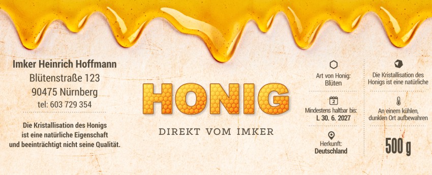 Wählen Sie die Honigsorte oder schreiben Sie Ihre eigene.Geben Sie Ihre Bezeichnung der Honigsorte ein.„Auf dem Etikett wird die ausgewählte Honigsorte angegeben.„Auf dem Etikett wird die ausgewählte Honigsorte angegeben.„Auf dem Etikett wird die ausgewählte Honigsorte angegeben.„Auf dem Etikett wird die ausgewählte Honigsorte angegeben.„Auf dem Etikett wird die ausgewählte Honigsorte angegeben.„Auf dem Etikett wird die ausgewählte Honigsorte angegeben.„Auf dem Etikett wird die ausgewählte Honigsorte angegeben.„Auf dem Etikett wird die ausgewählte Honigsorte angegeben.„Auf dem Etikett wird die ausgewählte Honigsorte angegeben.„Auf dem Etikett wird die ausgewählte Honigsorte angegeben.„Auf dem Etikett wird die ausgewählte Honigsorte angegeben.„Es wird keine Honigsorte angegeben. Es bleibt nur die Bezeichnung HONIG.