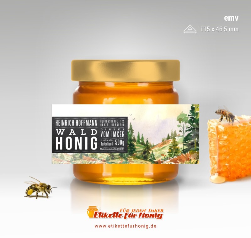 Selbstklebende Etikette für Honig in der Abmessung 115 x 46,5 mm, geeignet für Gläser größeren und kleineren Volumens, auf denen das Etikett dieser Abmessung gewiss Platz findet.