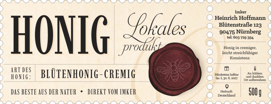 Das Etikett wird nach Ihren angegebenen Daten angepasst.Wir fügen Ihr Logo, Ihre Marke oder Ihr eigenes Bild in die Vorlage ein. Bitte laden Sie das Logo in der Bestellung hoch oder senden Sie es per E‑Mail.Wir färben das Etikett in Ihre Wunschfarben um (z. B. Farbe der Honigsorte, Firmenfarben, anderer Hintergrundton). Beschreiben Sie Ihre Vorstellung oder Farbangabe im Hinweisfeld.Wir passen die Schrift nach Ihren Wünschen an (anderer Stil, anderer Charakter). Beschreiben Sie Ihre Vorstellung im Hinweisfeld.Verschieben von Texten, Größenänderungen, andere Anordnung der Elemente innerhalb der Vorlage. Beschreiben Sie Ihre Vorstellung im Hinweisfeld.Wir fügen Ihr Foto ein (z. B. Bienenstöcke, Bienen, Landschaft). Bitte laden Sie das Foto in der Bestellung hoch oder senden Sie es per E‑Mail.Hinzufügen kleiner Elemente (Biene, Blume, Ornament), Detailanpassungen über die Standard‑Personalisierung hinaus. Beschreiben Sie Ihre Vorstellung im Hinweisfeld.Größere grafische Eingriffe, aber weiterhin auf Basis der Vorlage (deutlichere Änderungen, mehrere Anpassungen gleichzeitig). Beschreiben Sie Ihre Vorstellung im Hinweisfeld.Umfassende Überarbeitung des Designs, aber weiterhin auf Basis der Vorlage (deutliche Änderungen und Anpassungen, mehrere Eingriffe gleichzeitig). Beschreiben Sie Ihre Vorstellung im Hinweisfeld.