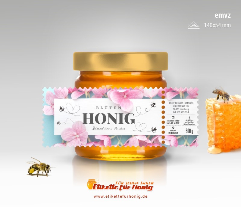 Selbstklebende Etikette für Honig in der Abmessung 140 x 54 mm, geeignet für Gläser größeren und kleineren Volumens, auf denen das Etikett dieser Abmessung gewiss Platz findet. Das Etikett hat einen gezahnten Rand wie eine Briefmarke, sodass auch der rechte Teil der Marke mit den Kontakten und den Pflichtangaben für das Aufkleben an anderem Ort einfach abgetrennt werden kann. Das Etikett behält auch nach dem Abtrennen des rechten Teils das gewünschte Aussehen, da der abgetrennte Teil ebenfalls den gleichen Rand hat.