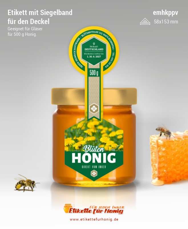 Startseite > Honigetiketten 58x153mm und 45x124mm, mit Siegelband > Honigetiketten 58x153mm, mit Siegelband (500g)