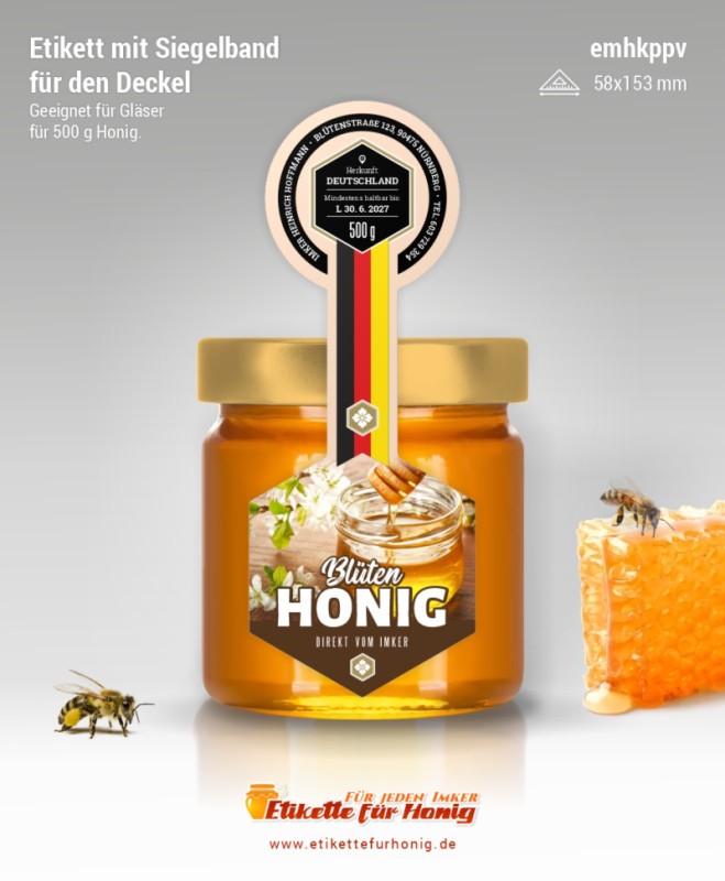 Startseite > Honigetiketten 58x153mm und 45x124mm, mit Siegelband > Honigetiketten 58x153mm, mit Siegelband (500g)
