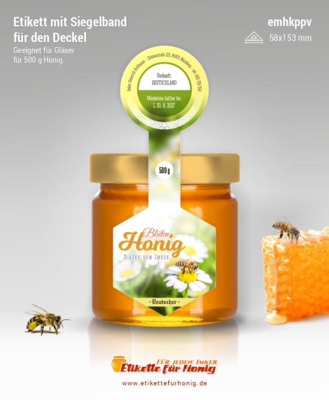 Startseite > Honigetiketten 58x153mm und 45x124mm, mit Siegelband > Honigetiketten 58x153mm, mit Siegelband (500g)