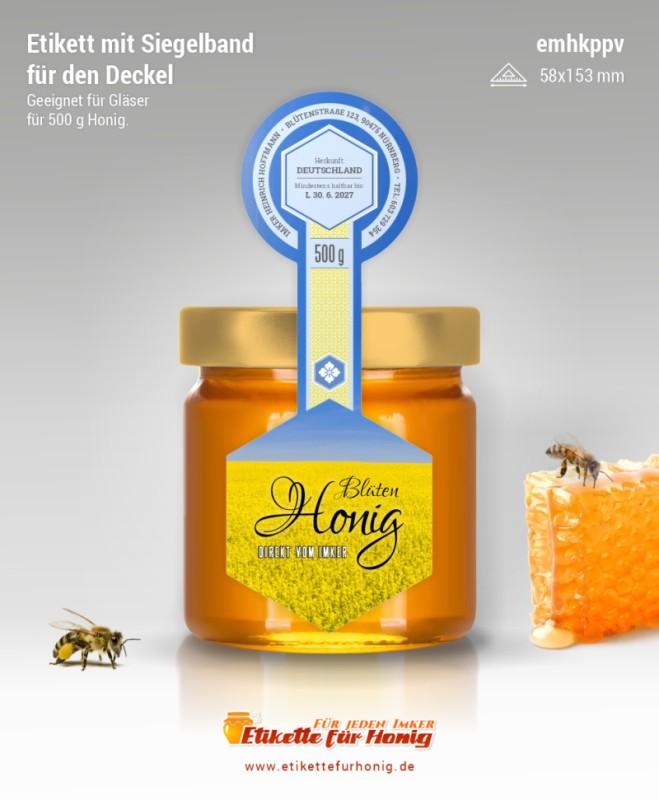 Startseite > Honigetiketten 58x153mm und 45x124mm, mit Siegelband > Honigetiketten 58x153mm, mit Siegelband (500g)