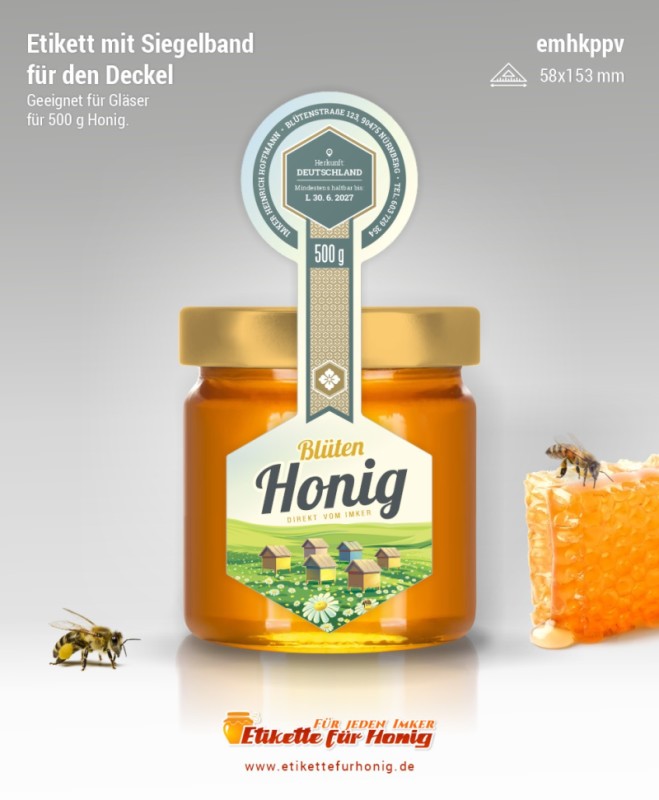 Startseite > Honigetiketten 58x153mm und 45x124mm, mit Siegelband > Honigetiketten 58x153mm, mit Siegelband (500g)