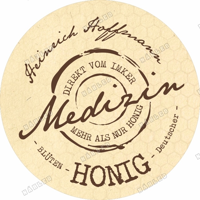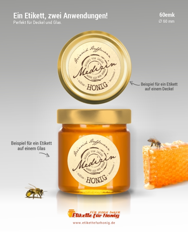 Runde Etikette für Honig, geeignet sowohl für Gläser aller Größen, als auch für alle Deckel, für die der Etikettdurchmesser von 60 mm passt.