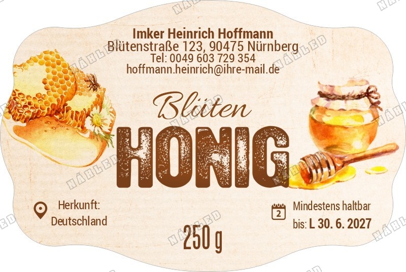 Wählen Sie die Honigsorte oder schreiben Sie Ihre eigene.Geben Sie Ihre Bezeichnung der Honigsorte ein.„Auf dem Etikett wird die ausgewählte Honigsorte angegeben.„Auf dem Etikett wird die ausgewählte Honigsorte angegeben.„Auf dem Etikett wird die ausgewählte Honigsorte angegeben.„Auf dem Etikett wird die ausgewählte Honigsorte angegeben.„Auf dem Etikett wird die ausgewählte Honigsorte angegeben.„Auf dem Etikett wird die ausgewählte Honigsorte angegeben.„Auf dem Etikett wird die ausgewählte Honigsorte angegeben.„Auf dem Etikett wird die ausgewählte Honigsorte angegeben.„Auf dem Etikett wird die ausgewählte Honigsorte angegeben.„Auf dem Etikett wird die ausgewählte Honigsorte angegeben.„Auf dem Etikett wird die ausgewählte Honigsorte angegeben.„Es wird keine Honigsorte angegeben. Es bleibt nur die Bezeichnung HONIG.