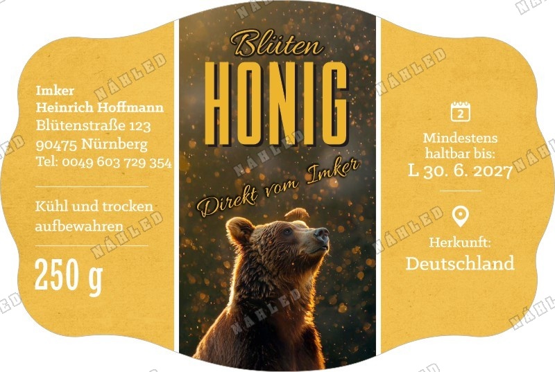 Stilvolles Honigetikett mit rustikalem, gewelltem Rand, ideal für Gläser verschiedener Größen – passt perfekt dort, wo das Format 70×47 mm verwendet werden kann.