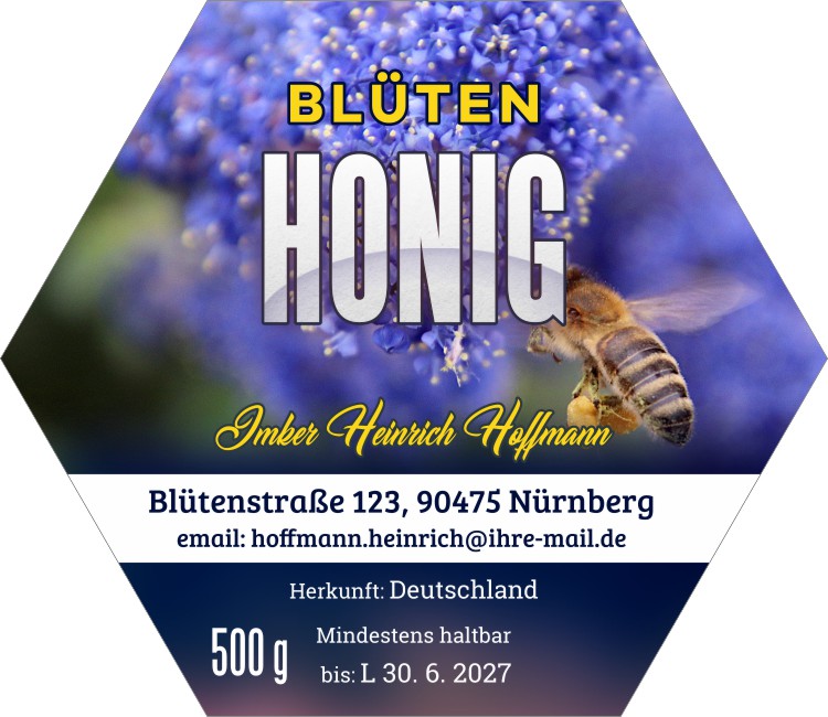 Wählen Sie die Honigsorte oder schreiben Sie Ihre eigene.Geben Sie Ihre Bezeichnung der Honigsorte ein.„Auf dem Etikett wird die ausgewählte Honigsorte angegeben.„Auf dem Etikett wird die ausgewählte Honigsorte angegeben.„Auf dem Etikett wird die ausgewählte Honigsorte angegeben.„Auf dem Etikett wird die ausgewählte Honigsorte angegeben.„Auf dem Etikett wird die ausgewählte Honigsorte angegeben.„Auf dem Etikett wird die ausgewählte Honigsorte angegeben.„Auf dem Etikett wird die ausgewählte Honigsorte angegeben.„Auf dem Etikett wird die ausgewählte Honigsorte angegeben.„Auf dem Etikett wird die ausgewählte Honigsorte angegeben.„Auf dem Etikett wird die ausgewählte Honigsorte angegeben.„Auf dem Etikett wird die ausgewählte Honigsorte angegeben.„Es wird keine Honigsorte angegeben. Es bleibt nur die Bezeichnung HONIG.