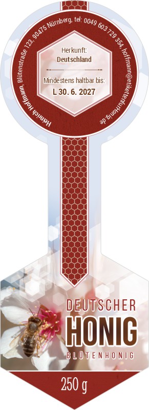 Wählen Sie die Honigsorte oder schreiben Sie Ihre eigene.Geben Sie Ihre Bezeichnung der Honigsorte ein.„Auf dem Etikett wird die ausgewählte Honigsorte angegeben.„Auf dem Etikett wird die ausgewählte Honigsorte angegeben.„Auf dem Etikett wird die ausgewählte Honigsorte angegeben.„Auf dem Etikett wird die ausgewählte Honigsorte angegeben.„Auf dem Etikett wird die ausgewählte Honigsorte angegeben.„Auf dem Etikett wird die ausgewählte Honigsorte angegeben.„Auf dem Etikett wird die ausgewählte Honigsorte angegeben.„Auf dem Etikett wird die ausgewählte Honigsorte angegeben.„Auf dem Etikett wird die ausgewählte Honigsorte angegeben.„Auf dem Etikett wird die ausgewählte Honigsorte angegeben.„Auf dem Etikett wird die ausgewählte Honigsorte angegeben.„Es wird keine Honigsorte angegeben. Es bleibt nur die Bezeichnung HONIG.