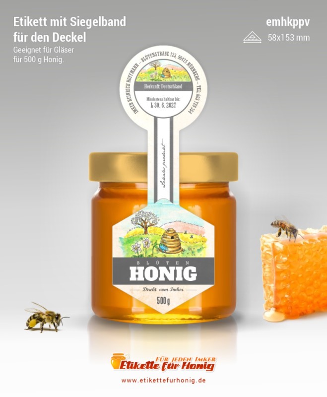 Startseite > Honigetiketten 58x153mm und 45x124mm, mit Siegelband > Honigetiketten 58x153mm, mit Siegelband (500g)