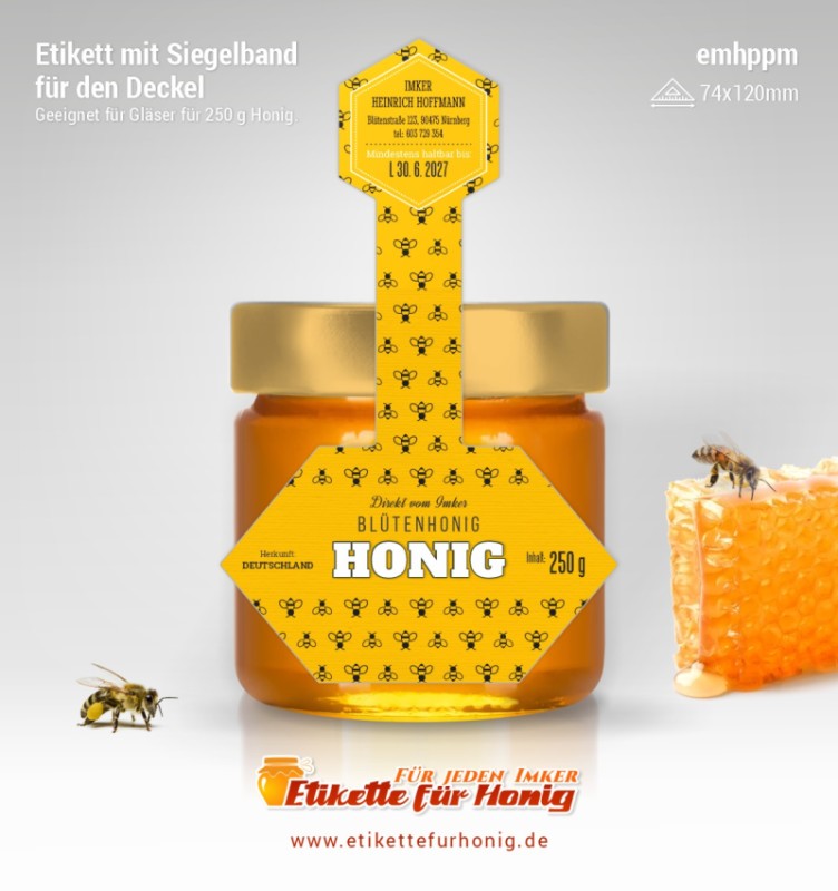 Startseite > Honigetiketten 93x150mm und 74x120mm, mit Siegelband > Honigetiketten 74x120mm, mit Siegelband (250g)
