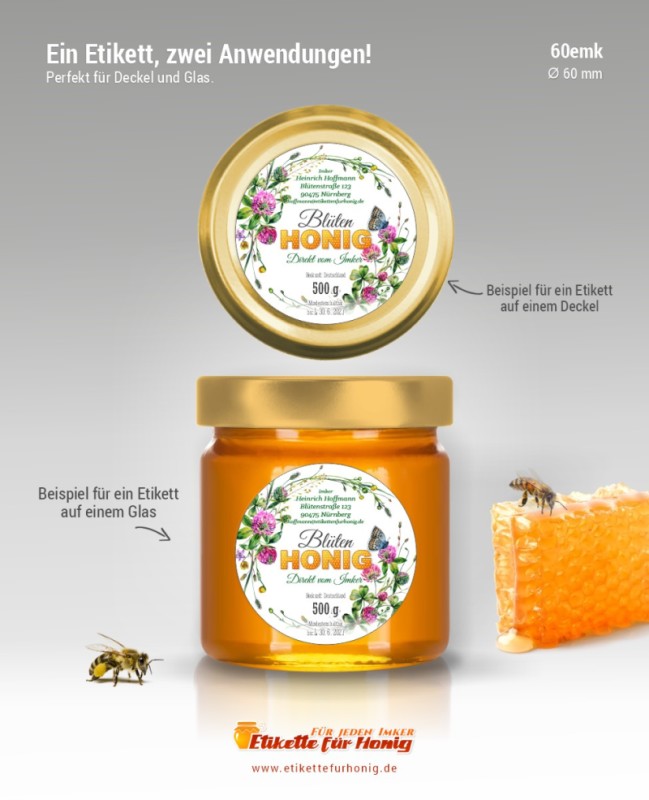 Runde Etikette für Honig, geeignet sowohl für Gläser aller Größen, als auch für alle Deckel, für die der Etikettdurchmesser von 60 mm passt.