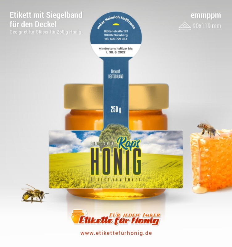 Startseite > Honigetiketten 114x146mm und 90x119mm, mit Siegelband > Honigetiketten 90x119mm, mit Siegelband (250g)