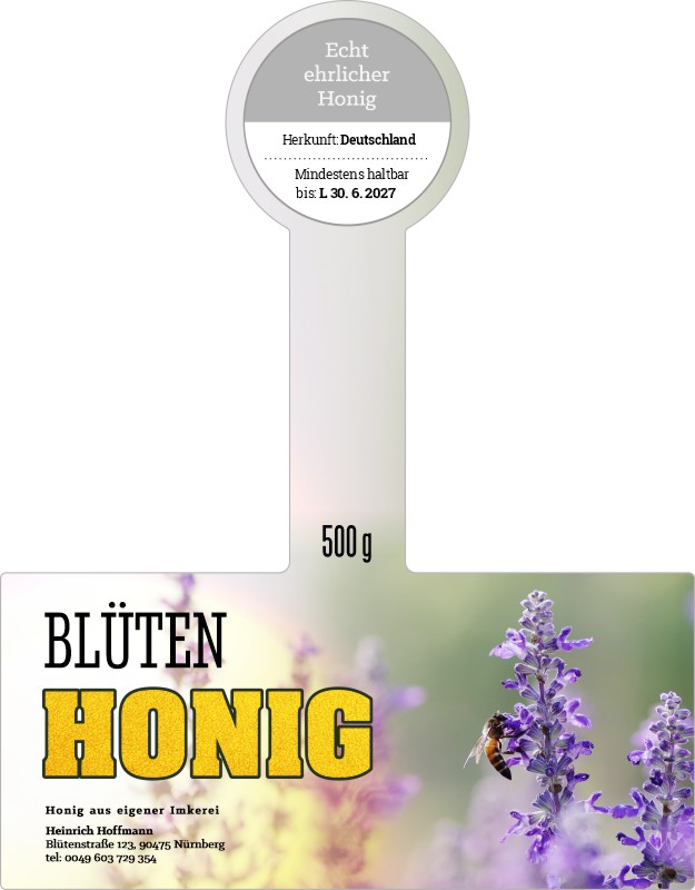 Wählen Sie die Honigsorte oder schreiben Sie Ihre eigene.Geben Sie Ihre Bezeichnung der Honigsorte ein.„Auf dem Etikett wird die ausgewählte Honigsorte angegeben.„Auf dem Etikett wird die ausgewählte Honigsorte angegeben.„Auf dem Etikett wird die ausgewählte Honigsorte angegeben.„Auf dem Etikett wird die ausgewählte Honigsorte angegeben.„Auf dem Etikett wird die ausgewählte Honigsorte angegeben.„Auf dem Etikett wird die ausgewählte Honigsorte angegeben.„Auf dem Etikett wird die ausgewählte Honigsorte angegeben.„Auf dem Etikett wird die ausgewählte Honigsorte angegeben.„Auf dem Etikett wird die ausgewählte Honigsorte angegeben.„Auf dem Etikett wird die ausgewählte Honigsorte angegeben.„Auf dem Etikett wird die ausgewählte Honigsorte angegeben.„Es wird keine Honigsorte angegeben. Es bleibt nur die Bezeichnung HONIG.