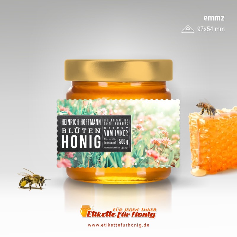 Selbstklebende Etikette für Honig mit gewelltem Zierrand, geeignet für Gläser größeren und kleineren Volumens, auf denen das Etikett der Abmessung 97 x 54 mm gewiss Platz findet.