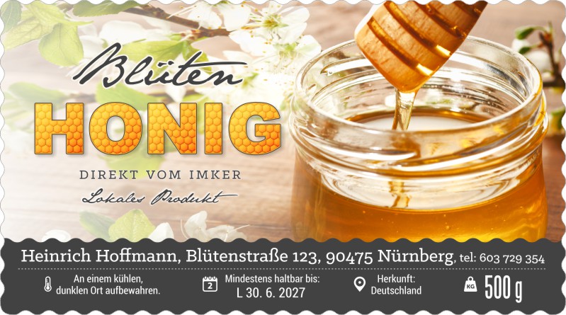 Wählen Sie die Honigsorte oder schreiben Sie Ihre eigene.Geben Sie Ihre Bezeichnung der Honigsorte ein.„Auf dem Etikett wird die ausgewählte Honigsorte angegeben.„Auf dem Etikett wird die ausgewählte Honigsorte angegeben.„Auf dem Etikett wird die ausgewählte Honigsorte angegeben.„Auf dem Etikett wird die ausgewählte Honigsorte angegeben.„Auf dem Etikett wird die ausgewählte Honigsorte angegeben.„Auf dem Etikett wird die ausgewählte Honigsorte angegeben.„Auf dem Etikett wird die ausgewählte Honigsorte angegeben.„Auf dem Etikett wird die ausgewählte Honigsorte angegeben.„Auf dem Etikett wird die ausgewählte Honigsorte angegeben.„Auf dem Etikett wird die ausgewählte Honigsorte angegeben.„Auf dem Etikett wird die ausgewählte Honigsorte angegeben.„Es wird keine Honigsorte angegeben. Es bleibt nur die Bezeichnung HONIG.